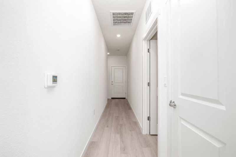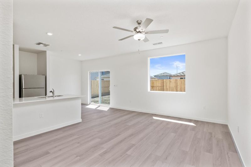 The Baker floor plan exemplifies a single-story home designed for both ease and elegance. This floorplan includes three well-sized bedrooms and an open-concept layout that enhances fluid movement throughout the home. The kitchen, featuring stainless steel appliances and stylish plank flooring, opens gracefully into the adjoining family and dining rooms, making it a central hub for everyday living and entertaining. A walk-in pantry adds a touch of convenience, offering ample storage for culinary essentials. The master bathroom is a luxurious feature with a large vanity and step-in shower, while the secondary bathroom is designed for versatility with a tub/shower combination.