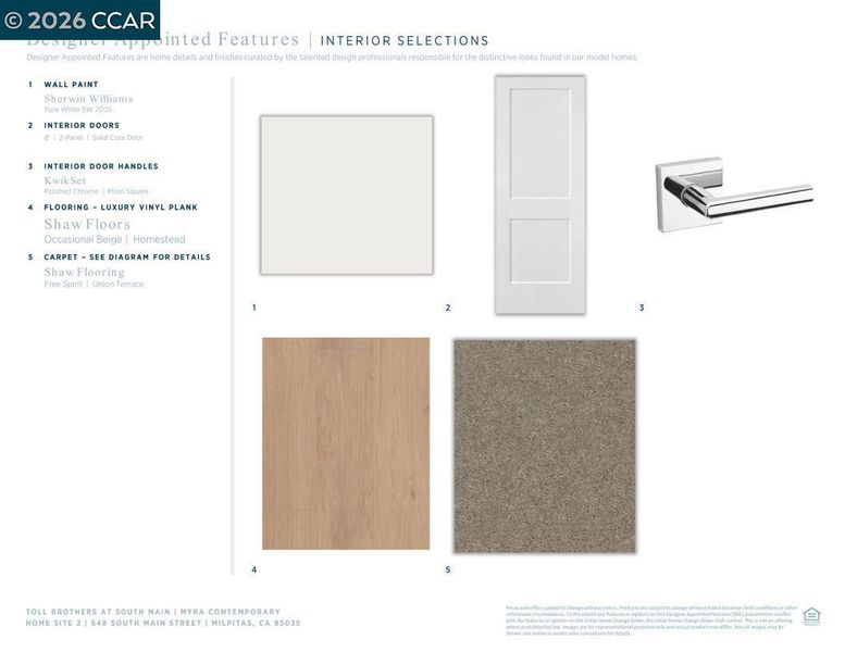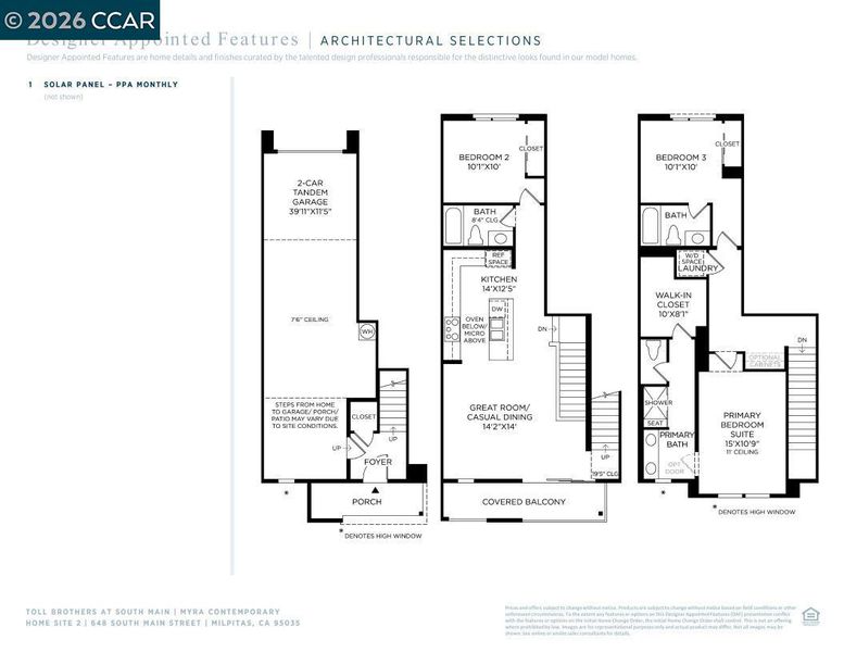 Find your new luxury home at South Main, an exclusive all-electric community of new townhomes in Milpitas. offers modern comfort across three thoughtfully designed levels. First floor access to the two-car garage with pre-wired EV charger, and tankless water heater. Second level, open-concept layout connects the great room and casual dining area to the kitchen, a center island with breakfast bar. Covered balcony off the main living area creates space for outdoor dining or relaxing. Secondary bedroom with access to a full hall bath provides flexibility for guests or extended stays. Third floor dedicated to private living, with a luxurious primary suite a generous walk-in closet, a spa-inspired bath, dual vanities, shower with seat, and a private water closet. Secondary bedroom with a private bath a convenient third-floor laundry area. Intimate enclave boasts a community park with tot lot, picnic areas. Its central location provides walkability to world-class shopping, dining, recreation such as Great Mall, Big Dog Vineyards, and Hidden Lake Park. Near the new Milpitas Transit Center featuring BART / VTA and convenient access to highways 680 / 880 / 237. (photos not of actual home, for marketing only)