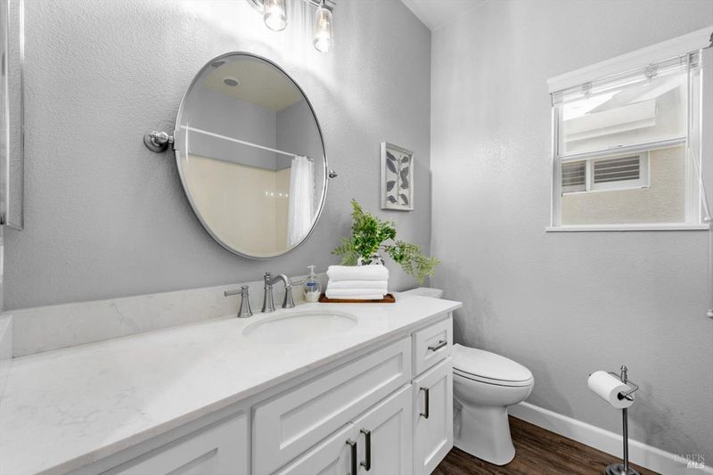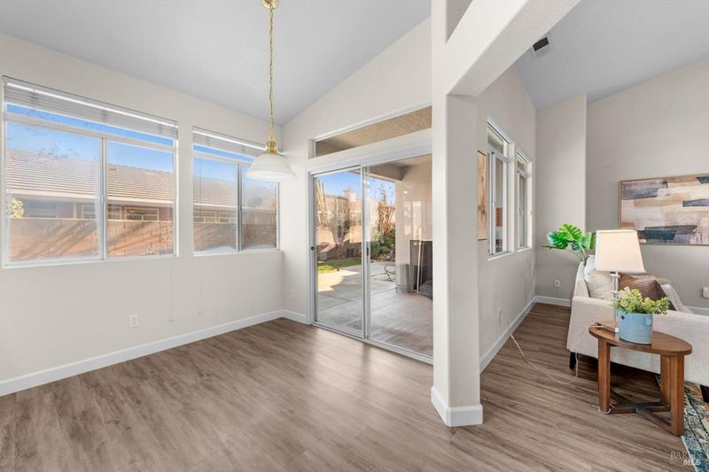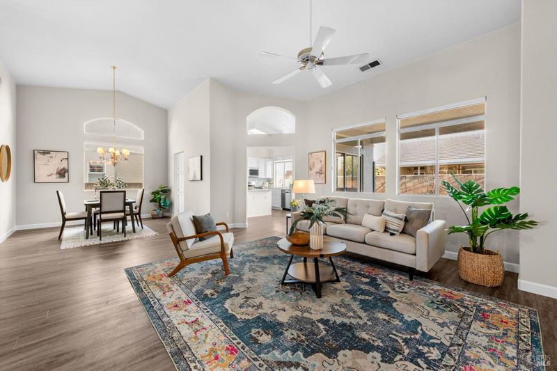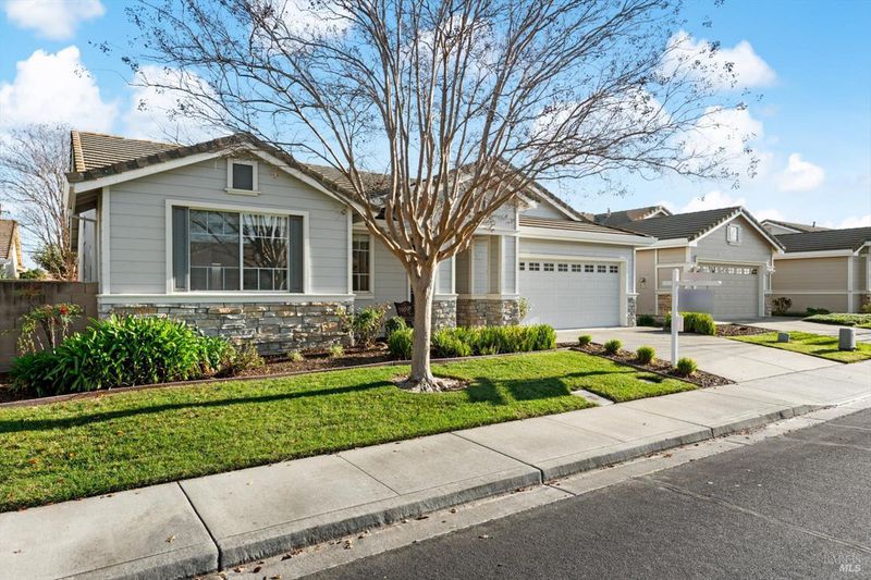 Located in the prestigious gated Diamond Grove Community in Vacaville, this beautifully maintained and remodeled senior home offers comfort, convenience and a prime location near the clubhouse, pool and recreation activities. Featuring 2-bedrooms plus a den, the open layout boasts high ceilings and ceiling fans. Spacious family room, dining area, den and kitchen create functional living space. Kitchen includes a breakfast dining area, granite counters, updated white cabinets, an island with bar seating, pantry cabinets for storage, a built-in desk area and stainless-steel appliances including a gas range, microwave and dishwasher. Updated luxury vinyl plank flooring throughout, along with many energy-efficient dual-pane windows and recessed lighting enhance the home's appeal. The primary bedroom offers a spacious walk-in closet with exterior access and vaulted ceilings with a ceiling fan. The ensuite showcases a beautifully remodeled bathroom with a stylish dual-sink vanity and spacious shower with modern gold fixtures. The updated secondary bathroom offers a shower over tub and a modern vanity, conveniently located near the second bedroom on the opposite side of the home for added privacy. The laundry room with cabinetry adds convenience. The low-maintenance backyard includes both covered and uncovered patios, a grass area and tranquil waterfall with a pond. The immaculate front exterior shines with its landscaping, stucco and stone exterior and tile roof. The affordable HOA includes front landscaping maintenance, exterior maintenance, roof, security gate, common area maintenance and access to community amenities, including a pool and clubhouse with events and activities. Conveniently located near shopping, dining, freeway access and healthcare, this home perfectly blends comfort, functionality and vibrant senior living.
