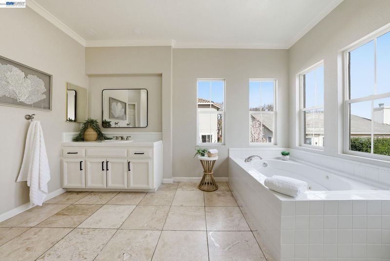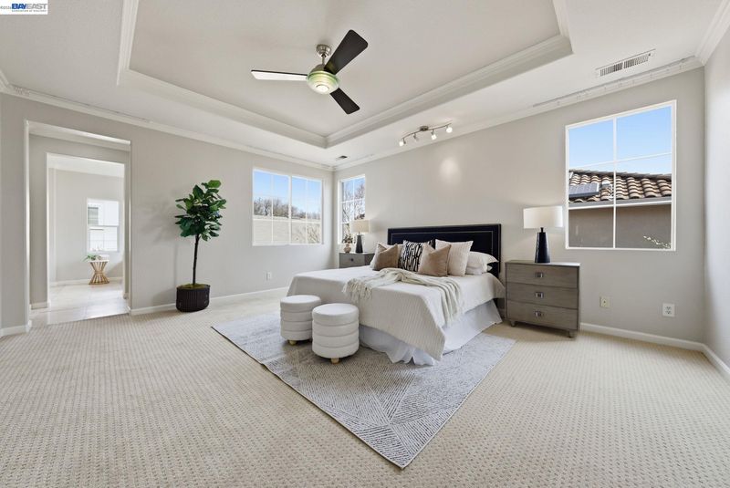 Westside San Ramon Court Location in Desirable Four Oaks. Beautiful 5-bedroom home + office/retreat, 4 full baths, and 3,362 sq ft with a 3-car garage, built in 1998. Over $150,000 in recent upgrades including fresh interior paint, upgraded lighting, and hardwood flooring across most of the lower level. The updated gourmet kitchen features stainless steel appliances, designer finishes, & abundant cabinetry. Step inside to soaring vaulted ceilings & abundant natural light creating a bright and inviting atmosphere. A convenient downstairs bedroom w/ adjacent full bath is ideal for guests or multi-generational living. Upstairs offers 4 additional oversized bedrooms and three full bathrooms. The expansive primary suite includes a private bonus retreat perfect for a home office, gym, or relaxing lounge. Enjoy a cozy backyard w/ variety of mature fruit trees including persimmon, mandarin, apple, plum, nectarine, pomegranate, & lemon. Additional features include fully paid solar and a 240V NEMA EV charger compatible with Tesla and other electric vehicles. Conveniently located near top-rated SRV schools, City Center shopping and dining, & easy access to Interstate 680, Interstate 580 & Bart.