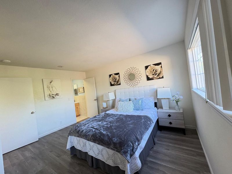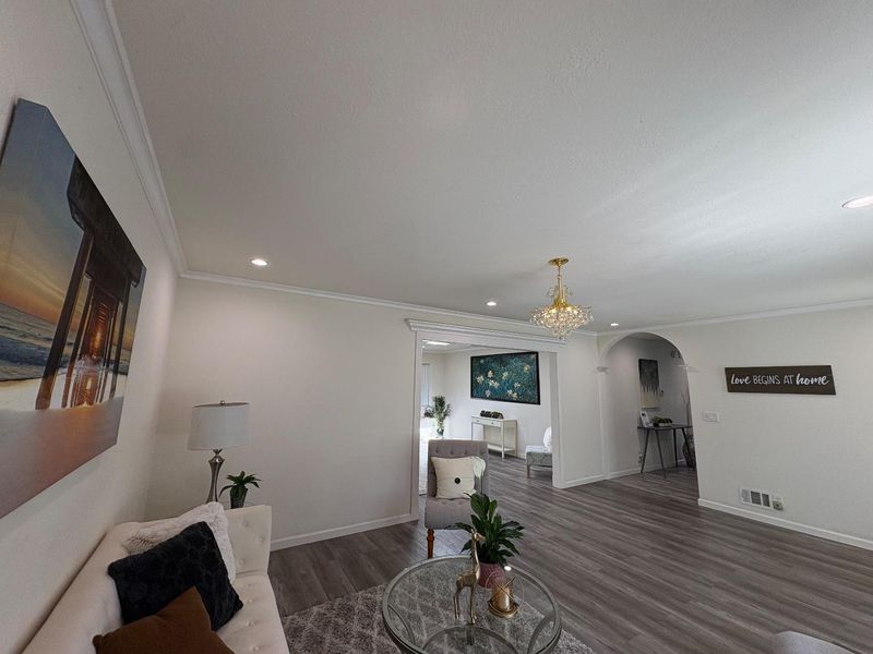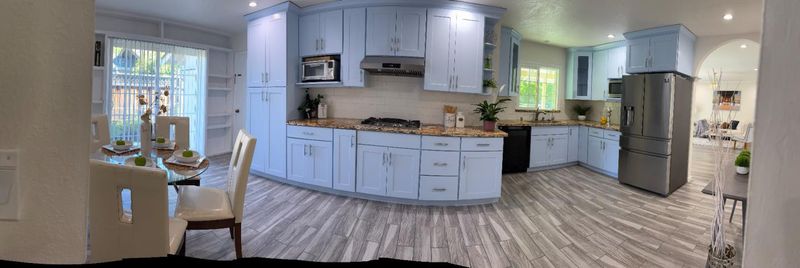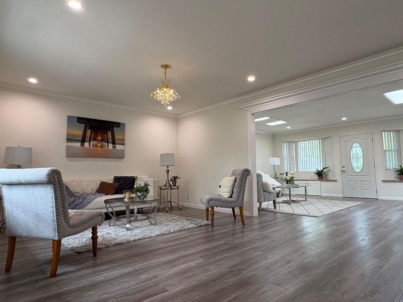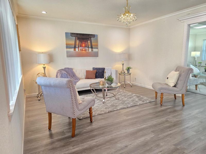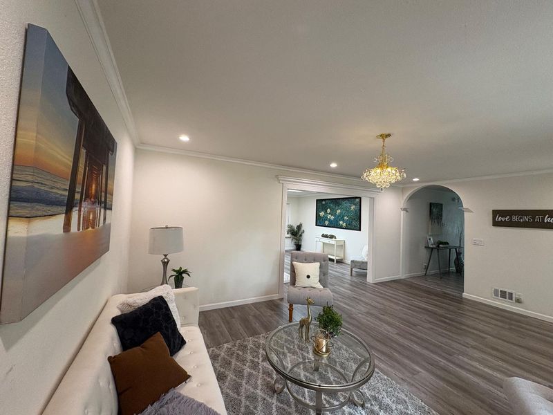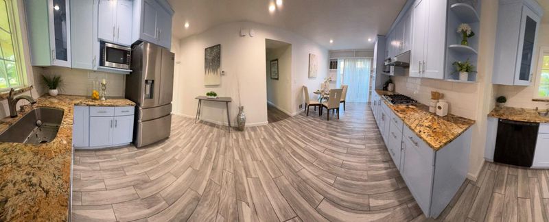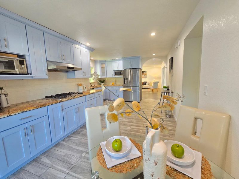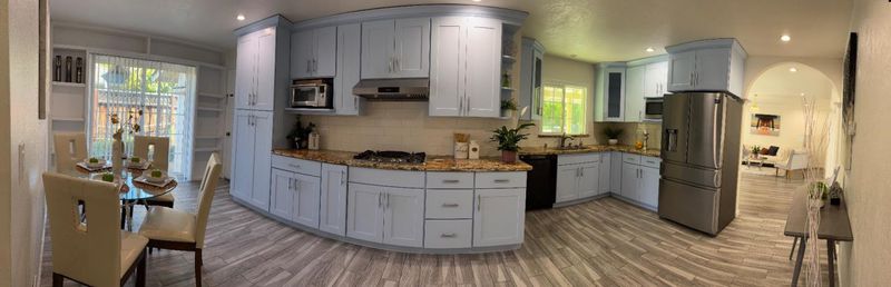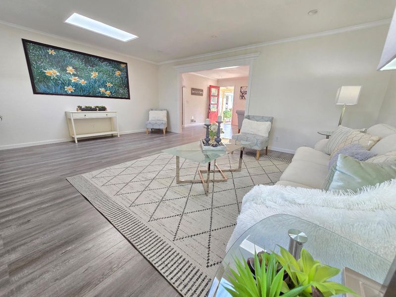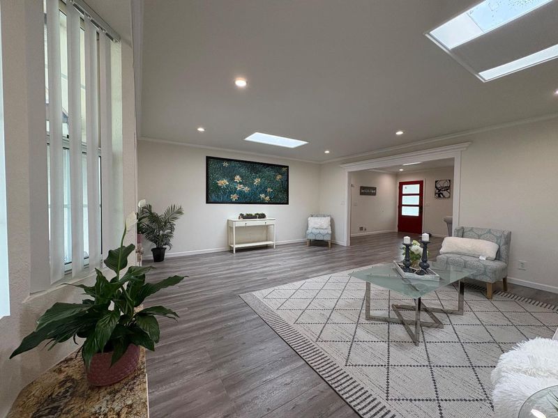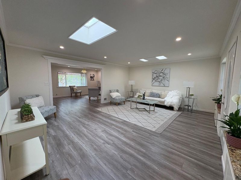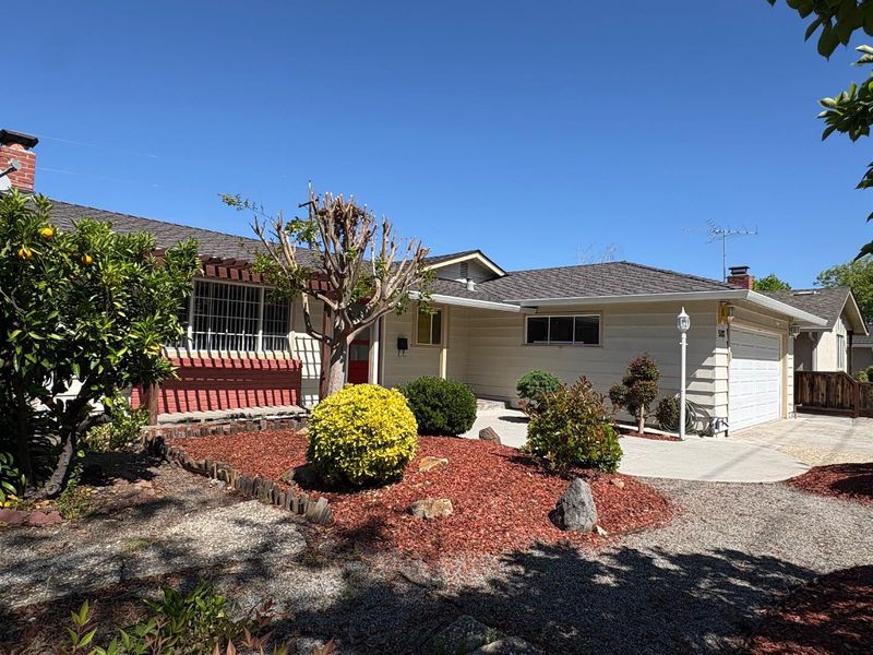 An exceptional location in Cupertino Area with modern updates/designs. Bright living room with crown molding, chandelier & front garden + mountain view. Living & family room-combo provides ample space for relaxation, while the living area is accentuated by skylights & indoor-outdoor access to brick patio under a wooden pergola. Tool shed in the backyard with many fruit trees & space for outdoor entertainment. Eat-in kitchen with thoughtfully designed kitchen featuring stainless steel appliances: a gas cooktop, a new air fryer oven toaster with multi-functions, granite countertops with cabinets-ample for storage, dishwasher, garbage disposal, microwave, pantry, and refrigerator, making it perfect for relaxing & comfort. Engineered hardwood floors, recessed lighting throughout main living areas, charming bay windows & skylights which add abundance of natural light throughout. Two updated bathrooms with tile finishes tile, granite counters, touch screen light mirrors and a primary stall shower enriched by skylights.Double pane windows, energy efficient- attic insulation, cooper plumbing, new water heater, new main door, ~7 year roof, security cameras & laundry in garage. Large lot with ADU/expansion potential! Close to Hi-Tech hubs, shopping, dining, schools & Easy Freeway Access!