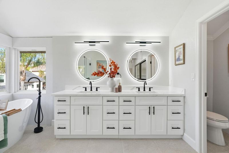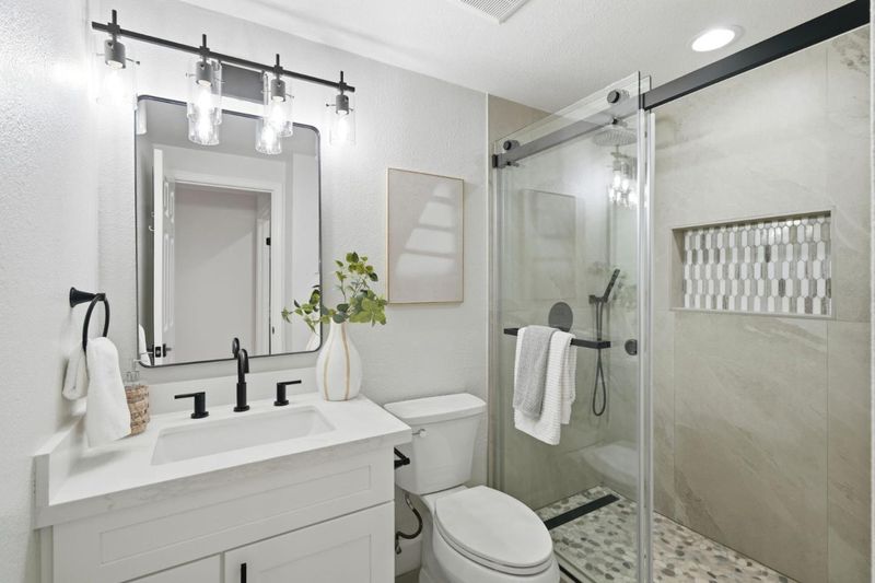 - Double Sinks, Full on Ground Floor, Primary - Stall Shower(s), Shower over Tub - 1, Stall Shower, Tile, Tub in Primary Bedroom, Updated Bath