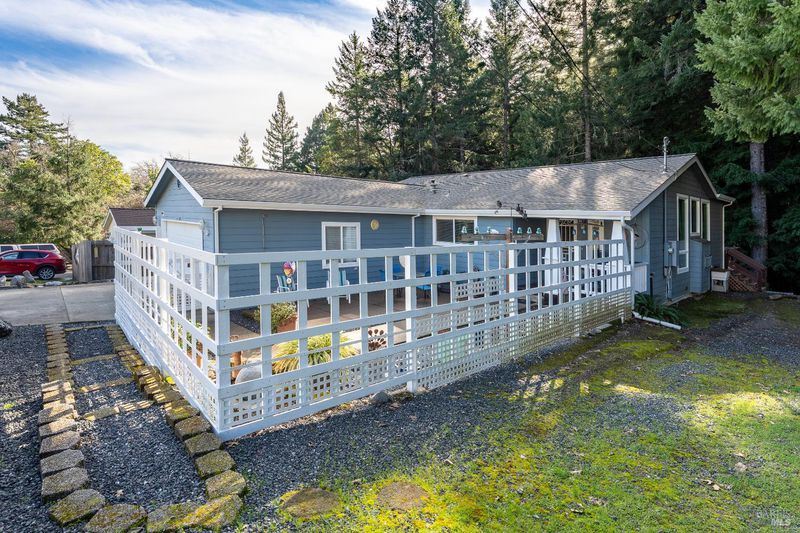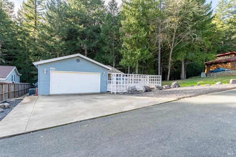 Set on a sunny, beautifully landscaped lot backing to protected greenbelt and the tranquil year-round Dutch Henry Creek, this inviting Brooktrails home offers comfort, functionality, and a peaceful natural setting. A flat, easy-access driveway leads to an attached two-car garage, all situated on a concrete perimeter foundation for durability and long-term value. The home welcomes you through a formal entryway, where elevated ceilings extend through the living and dining areas, creating a light-filled and spacious atmosphere. The open-concept layout connects the kitchen, dining, and living spaces with ease, ideal for both everyday living and gatherings. The living room is anchored by a propane fireplace and large dual-pane windows, bringing in natural light and views while adding warmth and efficiency. The kitchen features oak cabinetry, dishwasher, garbage disposal, and generous storage, flowing naturally into the dining area. A laundry/mud room off the garage adds convenience, with the washer and dryer included. A sliding glass door opens to the back deck overlooking the greenbelt and creek, offering a serene backdrop for morning coffee or evening relaxation. The fully fenced front yard includes a covered front porch, patio, walkways, and established landscaping with drainage improvements along the north side of the home designed for low maintenance and year-round enjoyment. The primary suite offers a peaceful retreat with a soaking tub, separate stall shower, dual sinks, and abundant cabinetry for storage. A hall bathroom with a shower-over-tub and single sink serves guests and additional bedrooms comfortably. Notable upgrades include central propane heating, air conditioning, an on-demand propane water heater, and roof was replaced in September 2018 by Mendocino Roofing. The home is wired for a backup generator, providing added peace of mind during outages. An insulated storage shed with electricity adds valuable flexibility for tools, hobbies, or additional storage. With its creekside greenbelt setting, functional upgrades, and thoughtful layout, this Brooktrails property offers a rare blend of privacy, comfort, and everyday ease.