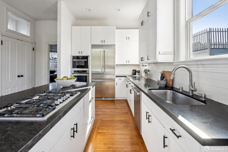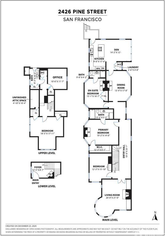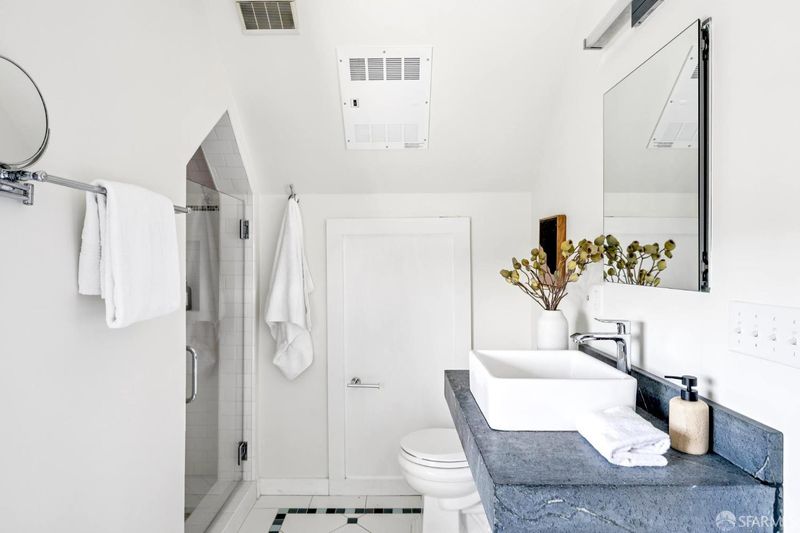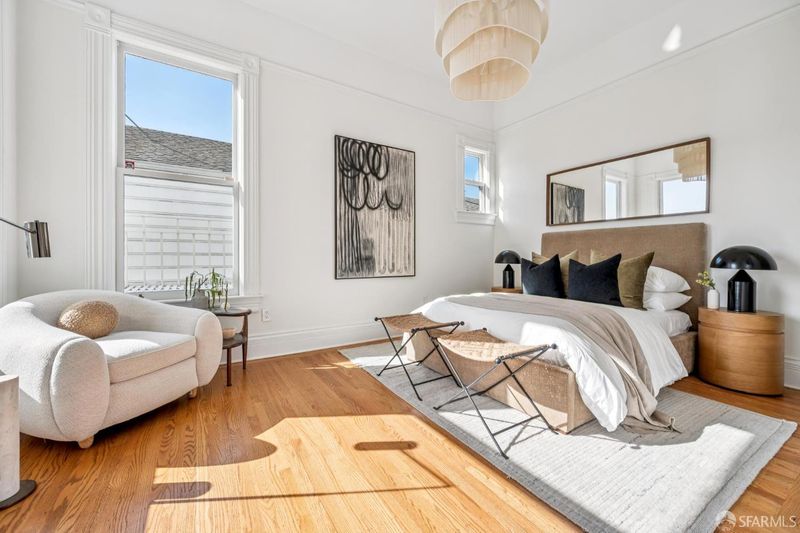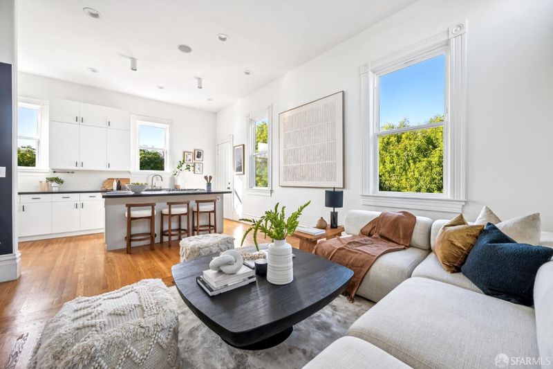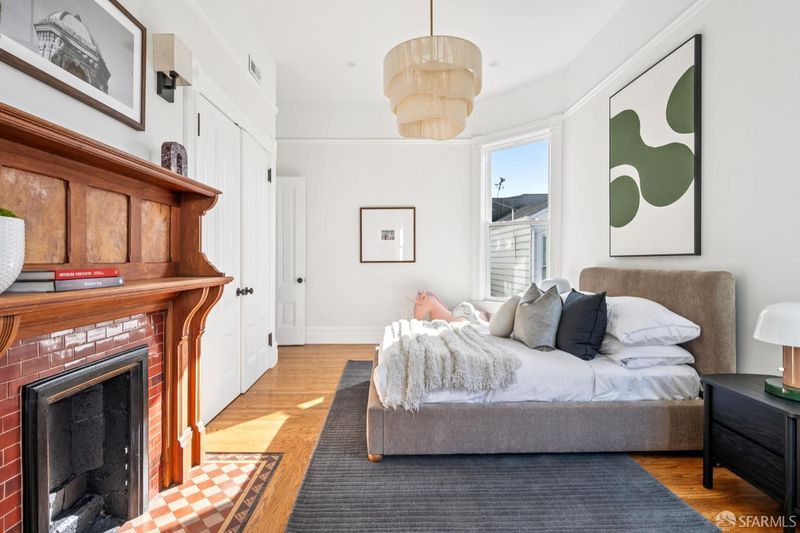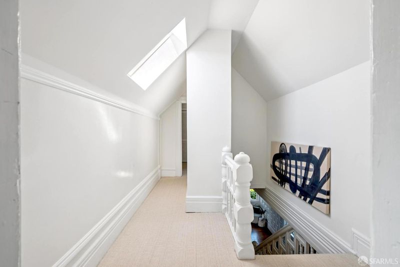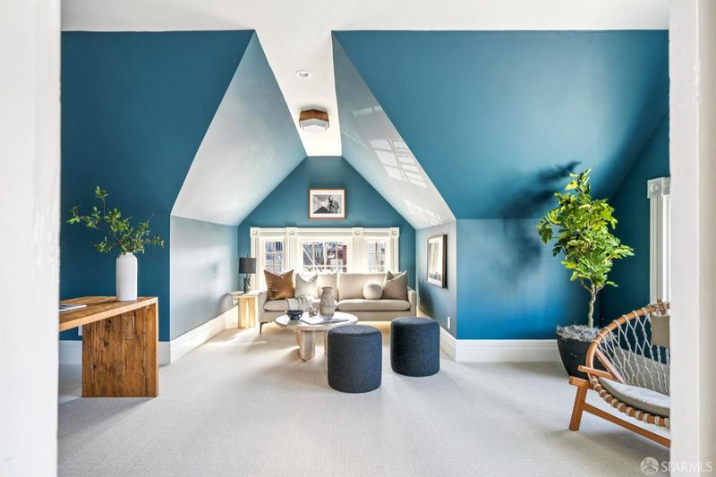 Perched atop a boutique two-unit Queen Anne building, this expansive top-floor condominium blends classic architectural detail with thoughtful modern updates across two flexible levels. The home is accessed via a gracious, gallery-scale entry on its own level, creating a dramatic sense of arrival and offering ideal wall space for art. Upstairs, the front of the residence is anchored by a spectacular formal living room featuring soaring 11'+ ceilings, rounded bay windows with open city views, a fireplace, and custom built-ins. Period details throughout include boxed-beam ceilings, hardwood floors, and multiple fireplaces. An expansive formal dining room is designed for entertaining and connects to an updated eat-in kitchen with stainless steel appliances and in-unit washer/dryer. An adjacent sitting area provides a comfortable space for casual living. The main living level includes a primary bedroom suite with walk-in closet, a second bedroom suite, and a third bedroom with built-ins. The upper level offers a third full bath, fourth bedroom, and an additional flexible room suitable for a media room, home office, gym, or guest space. Additional features include dual-zone hydronic heating with Nest thermostats and an approved set of plans for a roof deck off the back of the home. Ideally located in Lower Pacific Heights with a 98 Walk Score, close to Fillmore Street shops and dining, Mollie Stone's Market, Alta Plaza Park, and top private schools.