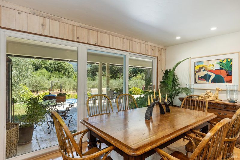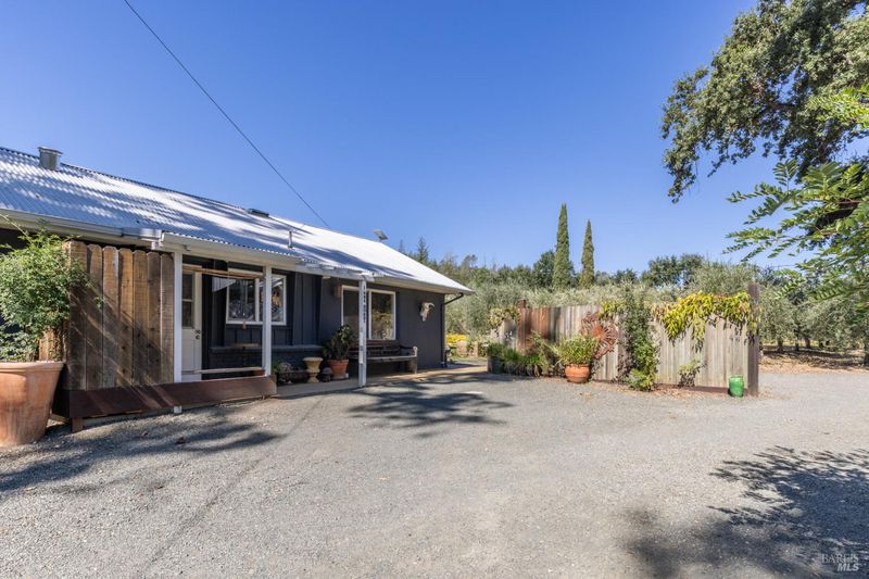 Set within a private country setting, this exceptional orchard ranch features over 200 mature olive trees spread across 2.57 acres of serene landscape. Offering a perfect balance of rural charm and modern comfort, the property includes an updated single-level main residence, a separate single-level second dwelling, and additional structures, together creating a peaceful, self-contained compound. Located less than 10 minutes from downtown St. Helena and only 2.5 miles from Lake Hennessey, the setting feels worlds away while remaining conveniently close to town. The main residence includes approximately 2,110 square feet and offers 2 bedrooms and 2.5 bathrooms with a spacious, inviting layout. Rustic hardwood and large-format stone floors, paired with a wood-burning fireplace, add warmth and character, while expansive sliding glass doors create an easy connection between indoor and outdoor living. The kitchen is both charming and functional, featuring a breakfast nook, granite countertops, high-end appliances, bar-top seating, and a generous walk-in pantry. A private flex room with a separate entrance provides versatility for a home office, gym, or creative space. Outdoors, the property truly shines. A covered back patio offers the perfect setting for entertaining or quiet relaxation, taking in sweeping views of the manicured olive orchard, neighboring vineyards, and surrounding mountains. A charming, updated 910 square-foot guest house and an 805 square-foot storage building are accessed via a gravel pathway or a separate entrance off Rossi Road, enhancing both privacy and usability. This olive orchard ranch offers a rare blend of peaceful country living just minutes from town. Whether you choose to cultivate and harvest your own olive oil or simply slow down and enjoy the privacy and bucolic surroundings, the setting invites a more intentional way of life.