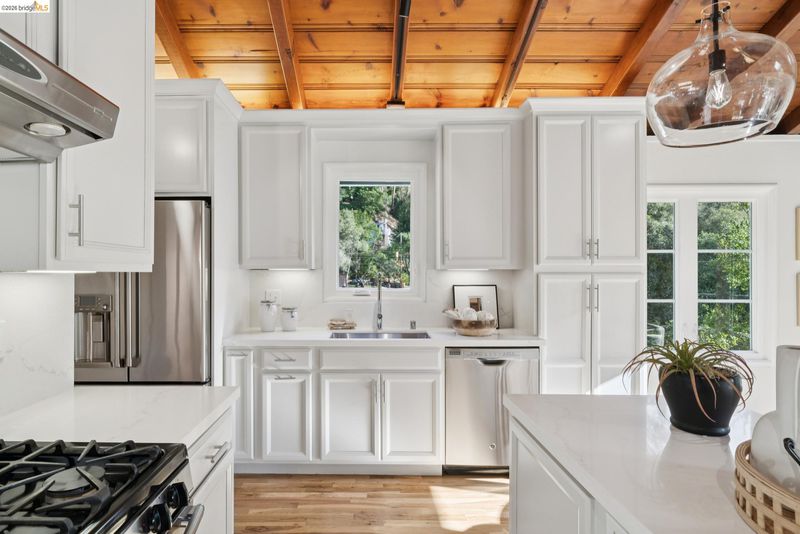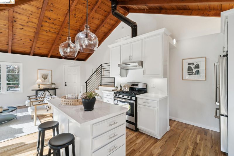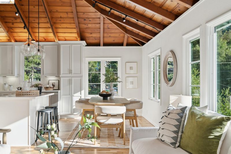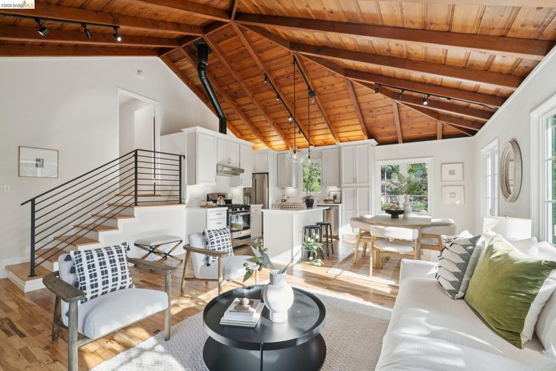 Drenched in sunlight, this sophisticated home features soaring vaulted ceilings and an open-concept floor plan for effortless California living. Antique oak floors, designer lighting, and custom railings add warmth, while nature-filled windows frame serene views. Seamless indoor-outdoor flow connects living spaces to expansive decks, perfect for entertaining. The remodeled kitchen is stylish and functional, with a large island, Caesarstone countertops and backsplash, generous cabinetry, and elegant finishes. Designer bathrooms feature contemporary vanities, designer flooring, and refined details. Four bedrooms and two baths are on one level, including a primary with French doors to a peaceful patio. The lower level offers versatile living with a separate entrance, ideal for a home office, an au pair suite, or extended family, while the upper level includes a spacious living room/den with natural beam ceilings. Mature landscaping and lovely foliage, enhances the setting, while a two-car garage with an adjacent storage room accommodates activity gear. Moments from Montclair Village—with tennis courts, parks, and a storybook library—and close to San Francisco transportation, this home is a rare urban retreat where timeless design, modern comfort, and natural beauty exist in harmony.
