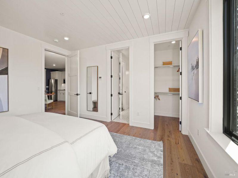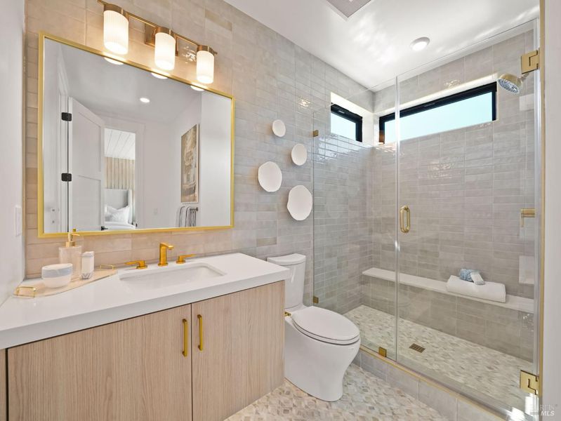 - Closet, Double Sinks, Dual Flush Toilet, Multiple Shower Heads, Soaking Tub, Tile, Tub, Walk-In Closet