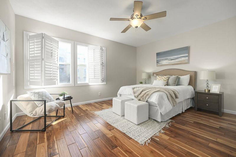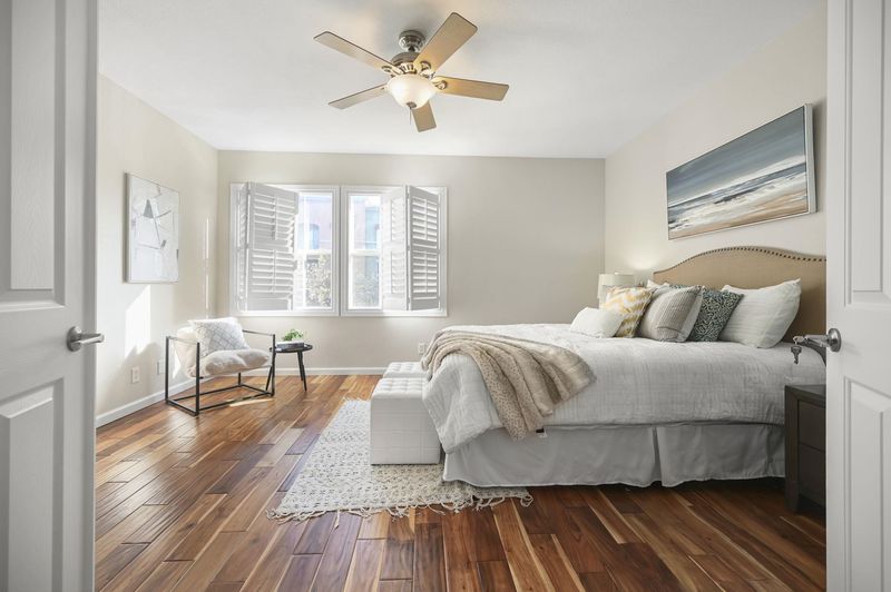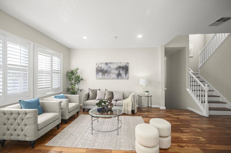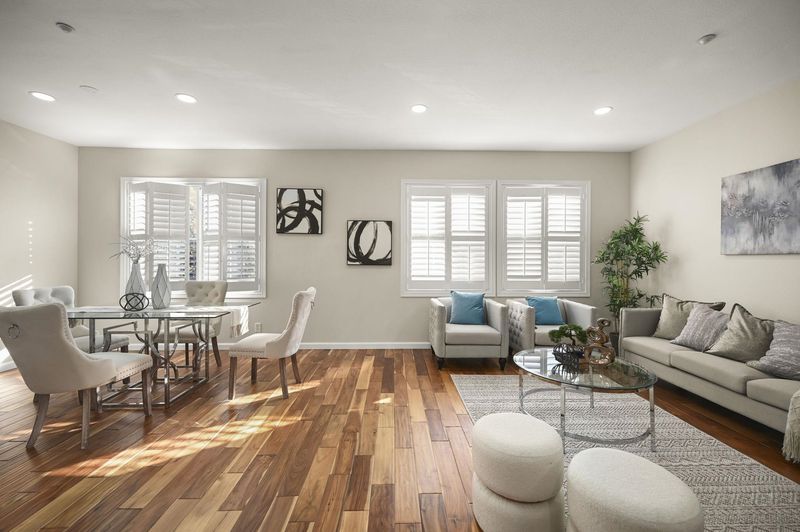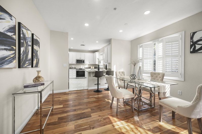 Stunning Corner 2BR/2BA Townhome on the quiet side of the complex, where light meets comfort in this pristine unit that blends contemporary elegance with everyday practicality. The open floor plan fills with natural light from expansive windows, with luxury hardwood floors flowing through the living, dining, bedrooms, and stairs. Custom plantation shutters, LED recessed lighting, and modern hardware elevate the ambiance. The gourmet kitchen offers stainless steel appliances, luxury vinyl flooring, a generous breakfast bar, Corian countertops, ample cabinetry, and modern knobs for entertaining. The spacious master retreat features a large closet. A balcony off the kitchen and first bedroom provides partial park views, perfect for morning coffee. A nearby laundry room with shelving adds convenience. Located near Emerald Glen Park and Dublin Wave, with top-rated schools nearby and easy access to BART, Whole Foods, major freeways, and abundant shopping and dining options, making this a true lifestyle residence.
