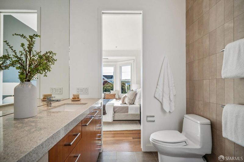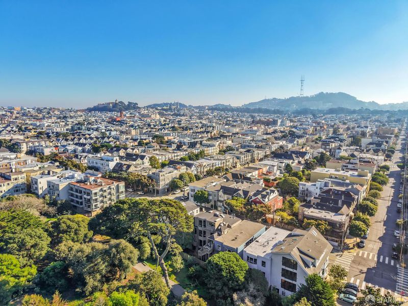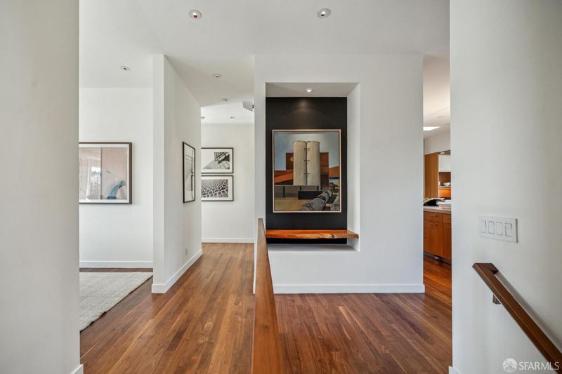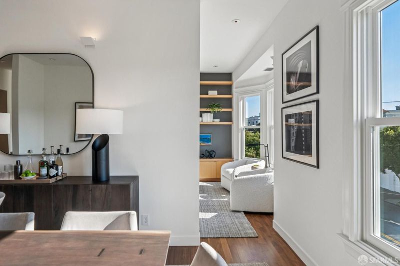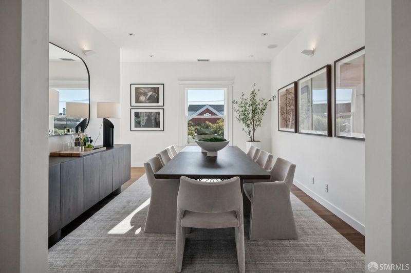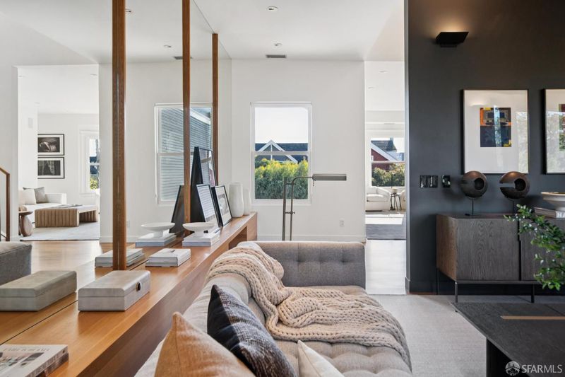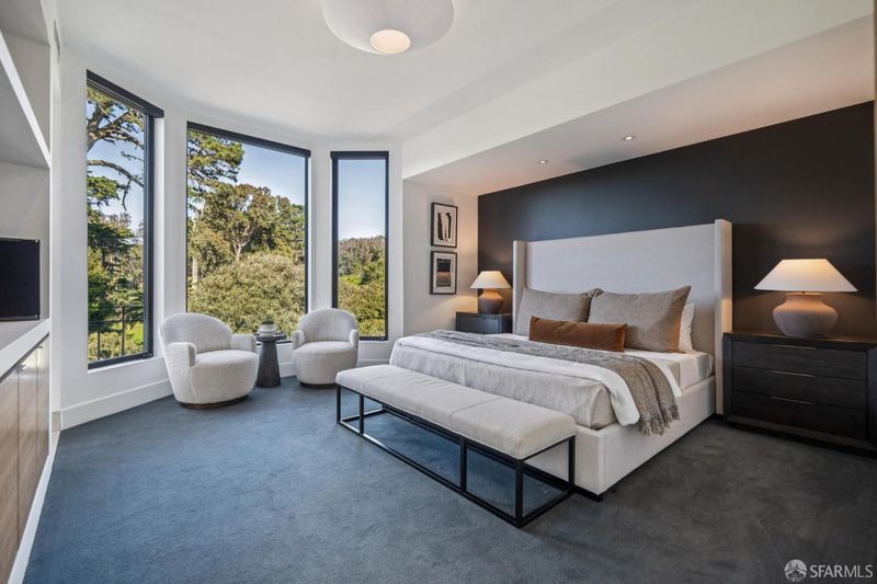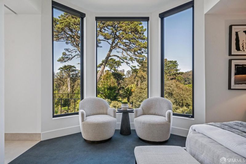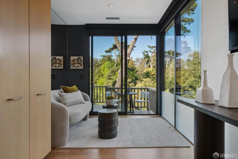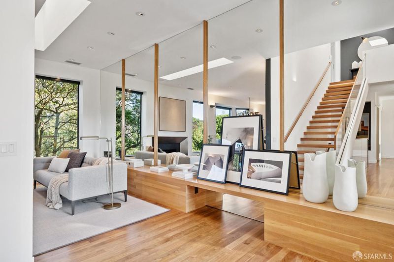 Spanning two levels this sophisticated residence designed by renowned Cass Calder Smith showcases natural light, an open floor plan and extraordinary park views. Sited on an extra-wide lot abutting Mountain Lake Park, the thoughtfully reimagined home celebrates its exceptional setting and light-infused interiors. Drawing daylight from numerous skylights and expansive windows, sunlight streams deep into the interior, creating a calm, even glow that shifts beautifully with the hours. The home's layout emphasizes flow both visual and physical. Open outlooks between rooms and outward to the park reinforce a sense of connection to nature while maintaining a distinctly modern sensibility. Refined materials, including rich American walnut floors throughout, natural limestone tiles in baths, and rift cut white oak cabinetry, underscore the architecture's warmth and restraint. The living area and kitchen form continuous space, oriented toward Mountain Lake Park and the Presidio. Here, the boundary between indoors and out dissolves. Large windows frame verdant park views and the east wall, clad with mirrored panels and vertical wood elements, reflects light and views back into the room. A wood-burning fireplace grounds the living area, while a Lindsey Adelman chandelier adds an ethereal counterpoint. The generously scaled, professionally appointed kitchen opens to a deck overlooking the park - ideal for morning coffee or evening relaxation. The formal dining room and the family room bask in bright, southern light. A dramatic, light-filled central staircase acts as both architectural focal point and spatial anchor. By day, a skylight animates the stair with natural light; by night, a striking David Weeks mobile light fixture transforms it into a sculptural moment. Upstairs, the primary bedroom and ensuite spa-like bath offer a serene, private retreat. While windows open to treetops and expansive views over the park, the suite's top floor location preserves privacy. A second bedroom with dramatic skylights and an ensuite bath functions seamlessly as a home office. A third bedroom with ensuite bath on the main level provides comfortable accommodations for family or guests. In every detail, this home demonstrates how modern design can be both expansive and intimate where light is not merely an amenity, but the unifying element that binds architecture, interior, and landscape into a singular, luminous experience.