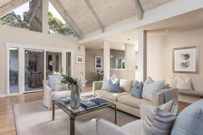 Pardon My Tree sits in Carmel's coveted Golden Rectangle, offering the rare convenience of a flat stroll to downtown shops, restaurants, and to the beach. Step inside to a warm and inviting living room with a classic Carmel stone fireplace, vaulted wood-beamed ceiling, and expansive windows that bathe the space in natural light. Both bedrooms are generously sized, with plush wool Berber carpet, ample closets, and sliding doors that open to a private deck. Details include hardwood floors, wood shutters, an open kitchen with adjoining dining area and 1 car garage with storage. Outdoors, multiple decks and a Carmel stone patio create serene spaces to enjoy the coastal lifestyle. With its one-level floor plan, meticulous upkeep, and unbeatable location, Pardon My Tree is a quintessential Carmel retreat where every day feels like a vacation and downtown is just a short, easy walk away.